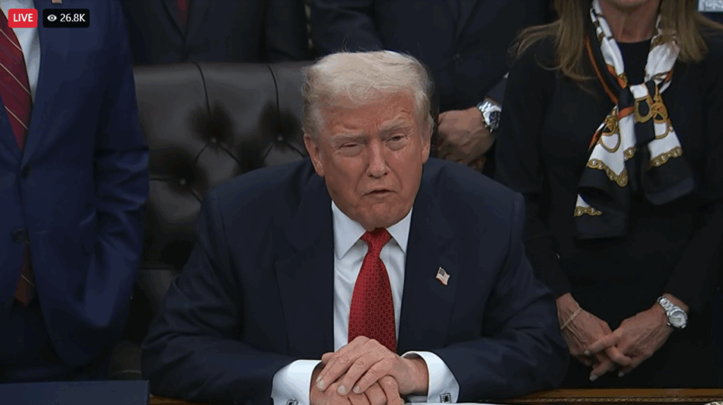 លោកប្រធានាធិបតី ដូណាល់ ត្រាំ បានផ្សាយផ្ទាល់ពេលចុះហត្ថលេខាលើក្រឹត្យអនុញ្ញាតឲ្យប្រើប្រាស់ច្បាប់នេះ។
