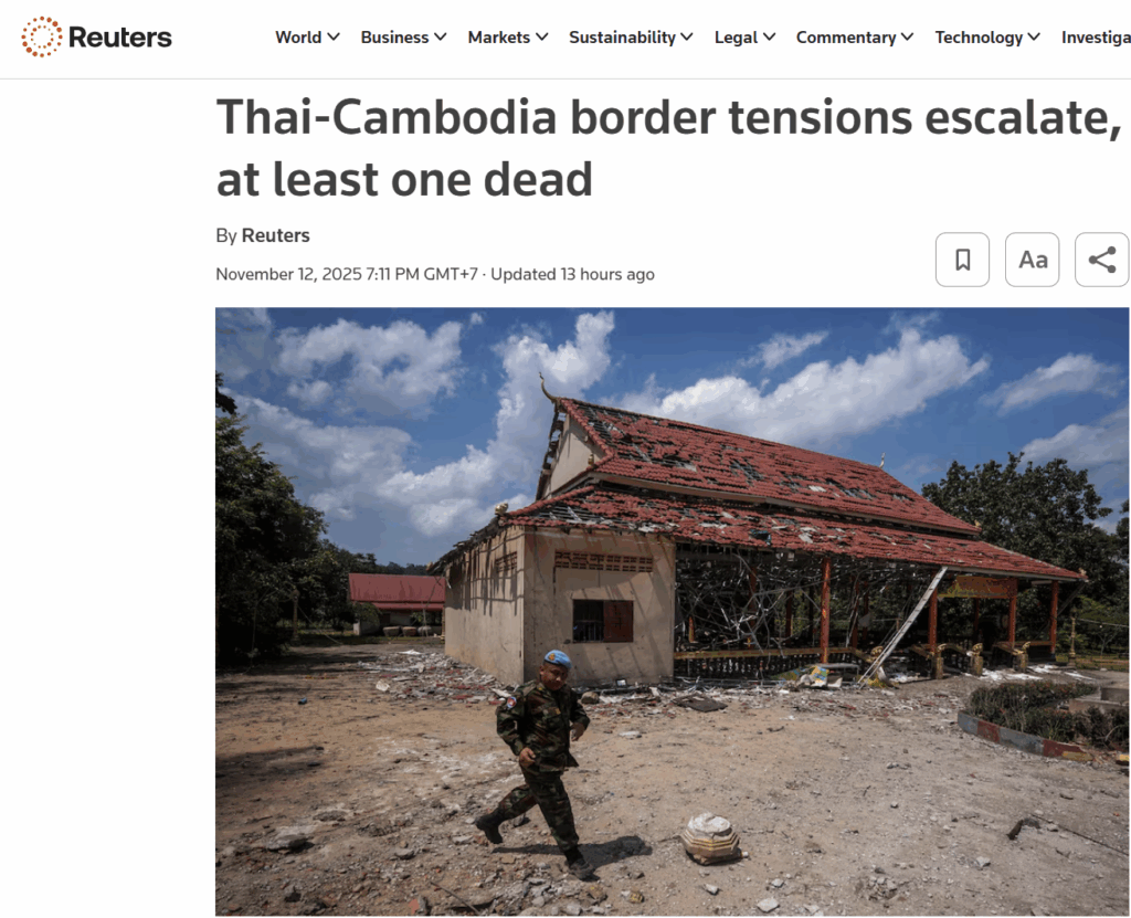 ចំណែកឯសារព័ត៌មាន Reuters របស់ចក្រភពអង់គ្លេសក៏បានរាយការណ៍ដែរថា៖ «មនុស្សម្នាក់ត្រូវបានសម្លាប់នៅក្នុងប្រទេសកម្ពុជា ជម្លោះជាមួយប្រទេសថៃផ្ទុះឡើងជាថ្មីកាលពីថ្ងៃពុធ»។