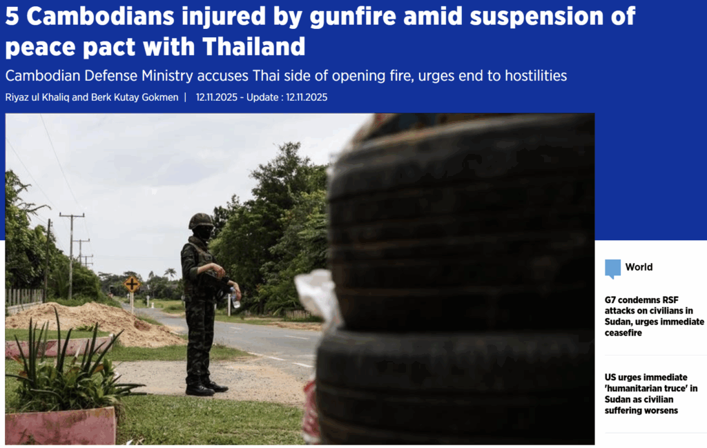 ដោយឡែក សារព័ត៌មាន Anadolu របស់ប្រទេសតួកគីក៏បានធ្វើការផ្សាយផងដែរថា ជនស៊ីវិលកម្ពុជាចំនួន ៥ នាក់ បានរងរបួសកាលពីថ្ងៃពុធ ដោយសារការបាញ់ប្រហារនៅតាមបណ្តោយព្រំដែនជាមួយប្រទេសថៃ ត្រឹមតែប៉ុន្មានថ្ងៃប៉ុណ្ណោះ បន្ទាប់ពីភាគីថៃបានប្រកាសផ្អាកកិច្ចព្រមព្រៀងសន្តិភាព។