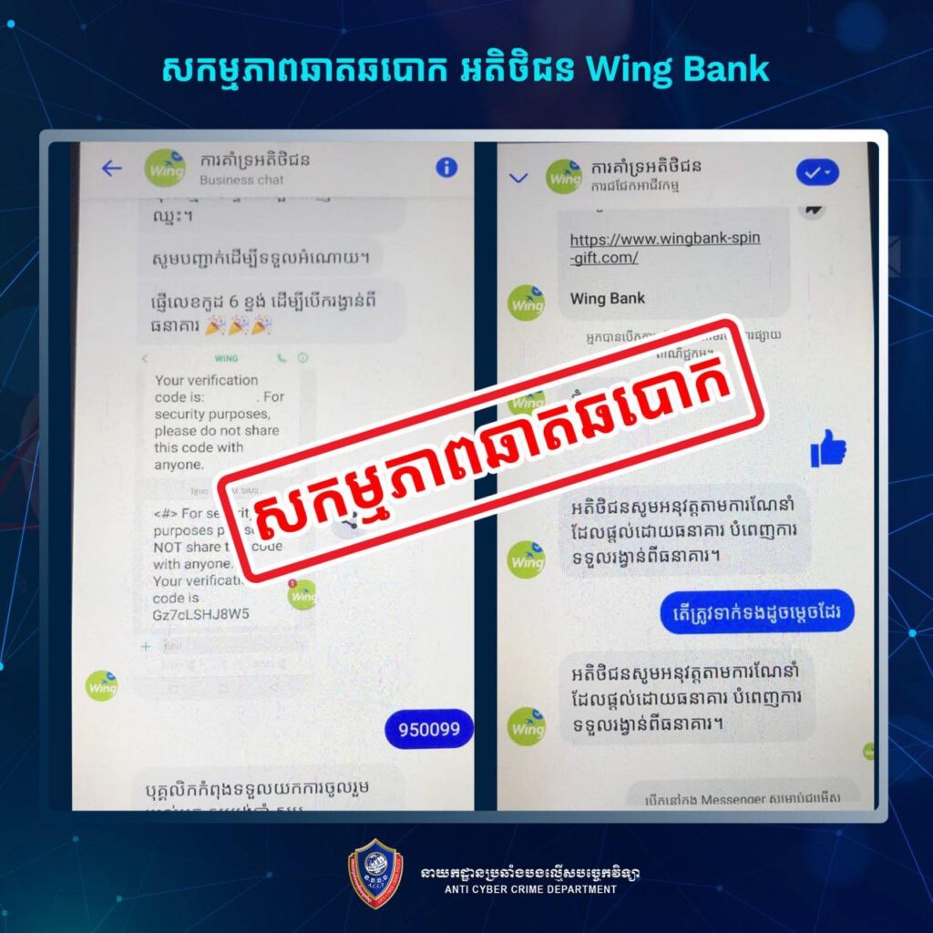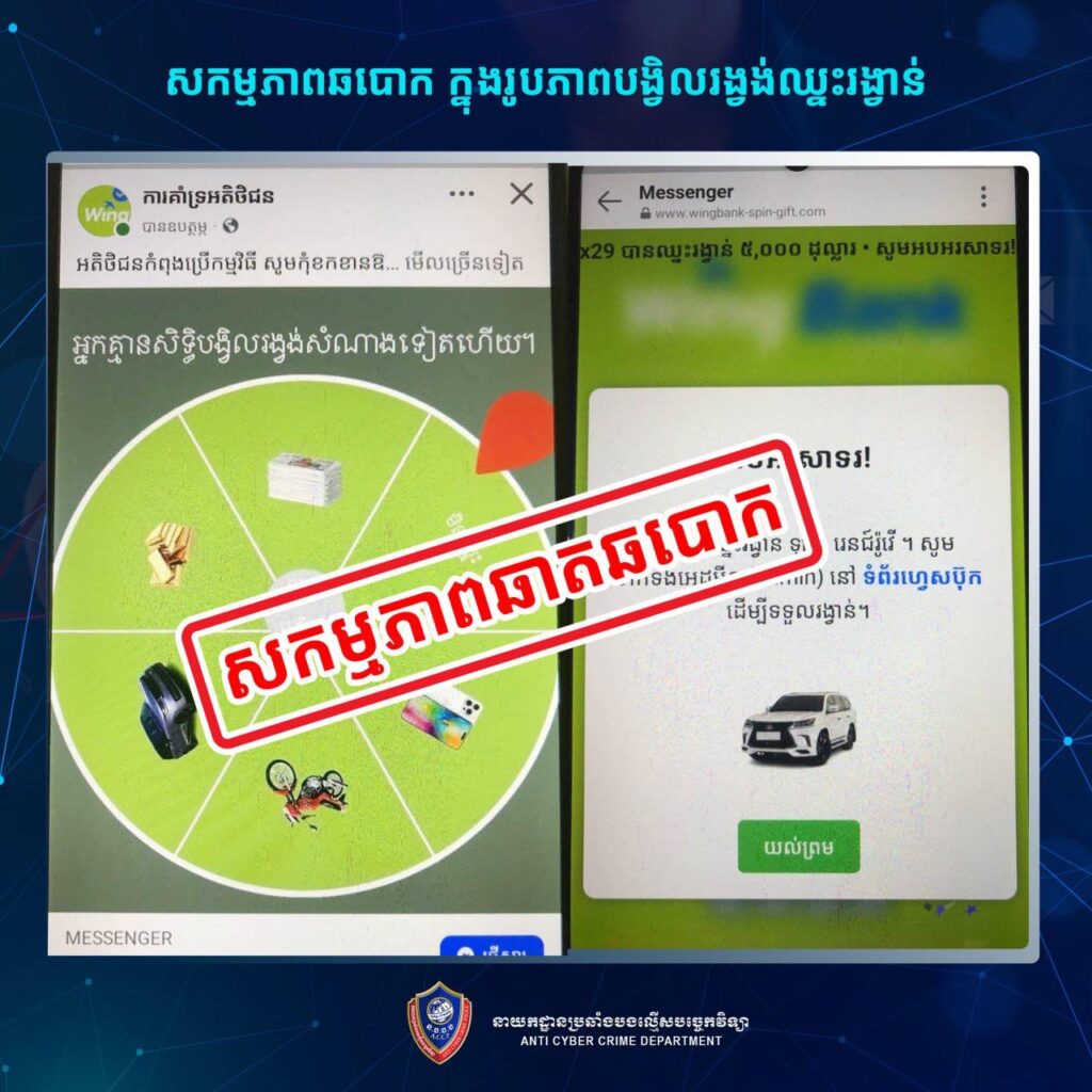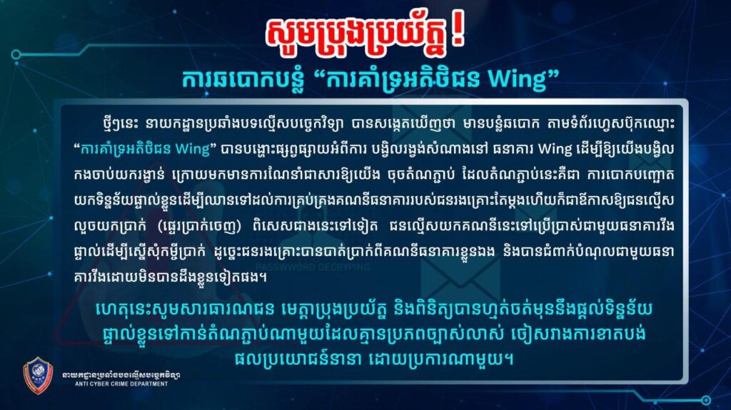 កម្លាំងជំនាញនៃនាយកដ្ឋានប្រឆាំងបទល្មើសបច្ចេកវិទ្យា កំពុងបើកការស្រាវជ្រាវយ៉ាងក្តៅគគុកលើករណីបោកប្រាស់ដ៏គ្រោះថ្នាក់មួយ ដែលបង្កឡើងដោយទំព័រហ្វេសប៊ុកឈ្មោះ “ការគាំទ្រអតិថិជន”។ ទំព័រនេះបានប្រើល្បិចបង្ហោះផ្សព្វផ្សាយអំពីការបង្វិលរង្វង់សំណាងនៅធនាគារ Wing ដើម្បីទាក់ទាញអតិថិជនឱ្យបង្វិលកងចាប់យករង្វាន់ តែធាតុពិតជាការឆបោកដើម្បីលួចយកប្រាក់តែប៉ុណ្ណោះ។