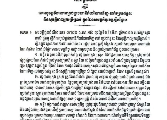 ខេត្តស្ទឹងត្រែង៖ រដ្ឋបាលខេត្តស្ទឹងត្រែងបានចេញសេចក្តីណែនាំយ៉ាងម៉ឺងម៉ាត់ស្តីពីការអនុវត្តវិធានការគ្រប់គ្រងហានិភ័យនៃការទិញ-លក់ប្រេងឥន្ធនៈ និងការការពារសុវត្ថិភាពអ្នកប្រើប្រាស់ ដើម្បីធានាឱ្យបាននូវស្ថិរភាពតម្លៃទីផ្សារ និងសណ្តាប់ធ្នាប់ក្នុងខេត្ត។ លោក សរ សុពុត្រា អភិបាលខេត្ត ក៏បានបញ្ជាឱ្យមន្ត្រីជំនាញចុះត្រួតពិនិត្យតាមស្ថានីយផ្ទាល់ ដើម្បីបង្ការការតម្លើងថ្លៃខុសប្រក្រតីដែលផ្ទុយពីសេចក្តីជូនដំណឹងរបស់ក្រសួងពាណិជ្ជកម្ម។ យោងតាមសេចក្តីជូនដំណឹង រដ្ឋបាលខេត្តបានដាក់ចេញនូវណែនាំសំខាន់ៗចំនួន ៣ ចំណុចដូចខាងក្រោម៖ ១-ការពង្រឹងការផ្សព្វផ្សាយ និងការអនុវត្តច្បាប់មន្ទីរ-អង្គភាពជំនាញ រួមជាមួយអាជ្ញាធរក្រុង ស្រុក ត្រូវចុះអប់រំ…
