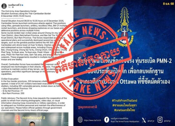 (ភ្នំពេញ)៖ ក្រសួងការពារជាតិកម្ពុជា បានចេញសេចក្តីប្រកាសព័ត៌មានយ៉ាងខ្លាំងក្លា ដើម្បីបដិសេធទាំងស្រុងនូវការចោទប្រកាន់របស់កងទ័ពថៃ ដែលថា កម្ពុជាបានចល័តសព្វាវុធធុនធ្ងន់នៅតាមបណ្តោយព្រំដែន។ លោកជំទាវ ឧត្តមសេនីយ៍ឯក ម៉ាលី សុជាតា អ្នកនាំពាក្យក្រសួងការពារជាតិ បានចេញមុខបដិសេធយ៉ាងច្បាស់លាស់ និងចាត់ទុកការផ្សាយរបស់ផេកផ្លូវការកងទ័ពភូមិភាគទី១ របស់ថៃ ថាជា «ព័ត៌មានក្លែងក្លាយ» ដែលមានចេតនាបង្កភាពតានតឹងយោធាឡើងវិញ។ «ក្រសួងការពារជាតិកម្ពុជា សូមបដិសេធយ៉ាងខ្លាំងក្លា និងចាត់ទុកការផ្សាយនេះថាជាព័ត៌មានមិនពិតទាំងស្រុង។…