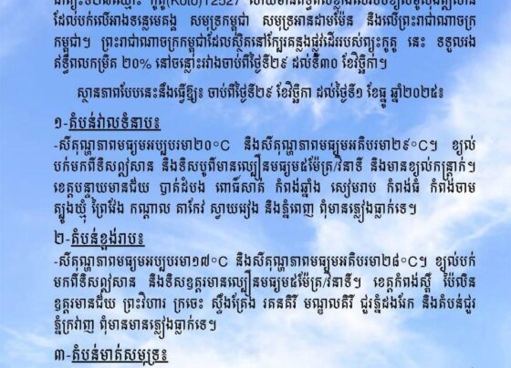 ភ្នំពេញ៖ ក្រសួងធនធានទឹក និងឧតុនិយម បានចេញព្រឹត្តិបត្រព័ត៌មានអំពីស្ថានភាពធាតុអាកាសនៅថ្ងៃទី២៩ ខែវិច្ឆិកា ឆ្នាំ២០២៥ ដែលបង្ហាញថាទីក្រុងភ្នំពេញ និងតំបន់វាលទំនាបជាច្រើនមិនមានភ្លៀងធ្លាក់ទេ។ សម្ពាធទាបដែលកើតនៅមហាសមុទ្រប៉ាស៊ីហ្វិកខាងលិច និងសមុទ្រចិនខាងត្បូង បានវិវត្តទៅជាព្យុះទី២៧ឈ្មោះ ភូតូ (Koto) T2527 ដែលមានឥទ្ធិពលខ្លាំងលើរបបខ្យល់មូសុងឦសាន។ ព្រះរាជាណាចក្រកម្ពុជាទទួលរងឥទ្ធិពលកម្រិត ២០% នៅចន្លោះថ្ងៃទី២៩ ដល់ទី៣០ ខែវិច្ឆិកា។…