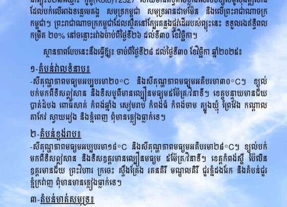 ភ្នំពេញ៖ ក្រសួងធនធានទឹក និងឧតុនិយម បានចេញសេចក្ដីជូនដំណឹងថា ព្យុះទី២៧ឈ្មោះ “កូតូ” ដែលកើតចេញពីសម្ពាធទាបនៅមហាសមុទ្រប៉ាស៊ីហ្វិកខាងលិច និងសមុទ្រចិនខាងត្បូង កំពុងមានឥទ្ធិពលលើរបបខ្យល់មូសុងឦសាននៅកម្ពុជា។ ក្រសួងបានបញ្ជាក់ថា កម្ពុជាទទួលរងឥទ្ធិពលកម្រិត២០% ពីព្យុះនេះ ចាប់ពីថ្ងៃទី២៦ ដល់ទី៣០ ខែវិច្ឆិកា ឆ្នាំ២០២៥។ ទោះបីជាមានឥទ្ធិពល ប៉ុន្តែប្រទេសកម្ពុជាទាំងមូលនឹងពុំមានភ្លៀងធ្លាក់ទេ។ ស្ថានភាពអាកាសធាតុចាប់ពីថ្ងៃទី២៨ ដល់ទី៣០…
